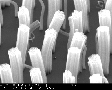 The SEM image below shows part of an array of 20 micron carbon nanotube turfs that are used as a thermal switch in a MEMS device. The vertically aligned turfs are grown on a sol-gel substrate which is patterned using the photolithography equipment in the cleanroom. The process allows for precise control of the position and size of the nanotube turf, creating arrays of turfs as small as 5 microns to be grown.