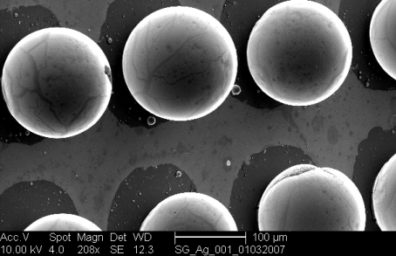 These 100 micron size gallium doplets are used for a MEMS switch. They are built ontop of a silicon wafer that is processed in the cleanroom. When the temperature of the gallium is slightly elevated from room temperature, it becomes a liquid and can be used as a very reliable switch. It is better behaved than a mechanical switch which can induce large current spikes when turning on. Another advantage is that these gallium droplets virtually have an infinite life with no mechanical wear.