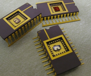 The cadmium zinc telluride cube (CdZnTe or CZT) in the bottom left of the picture was grown, cut and polished here at WSU and was patterned with the 4 x 4 array of pixels in the cleanroom. The pattern was aligned to a circuit board (right) and mounted. These CZT cubes are high-resolution single crystals that can detect high energy x-rays & gamma rays for medical imaging and homeland security applications.